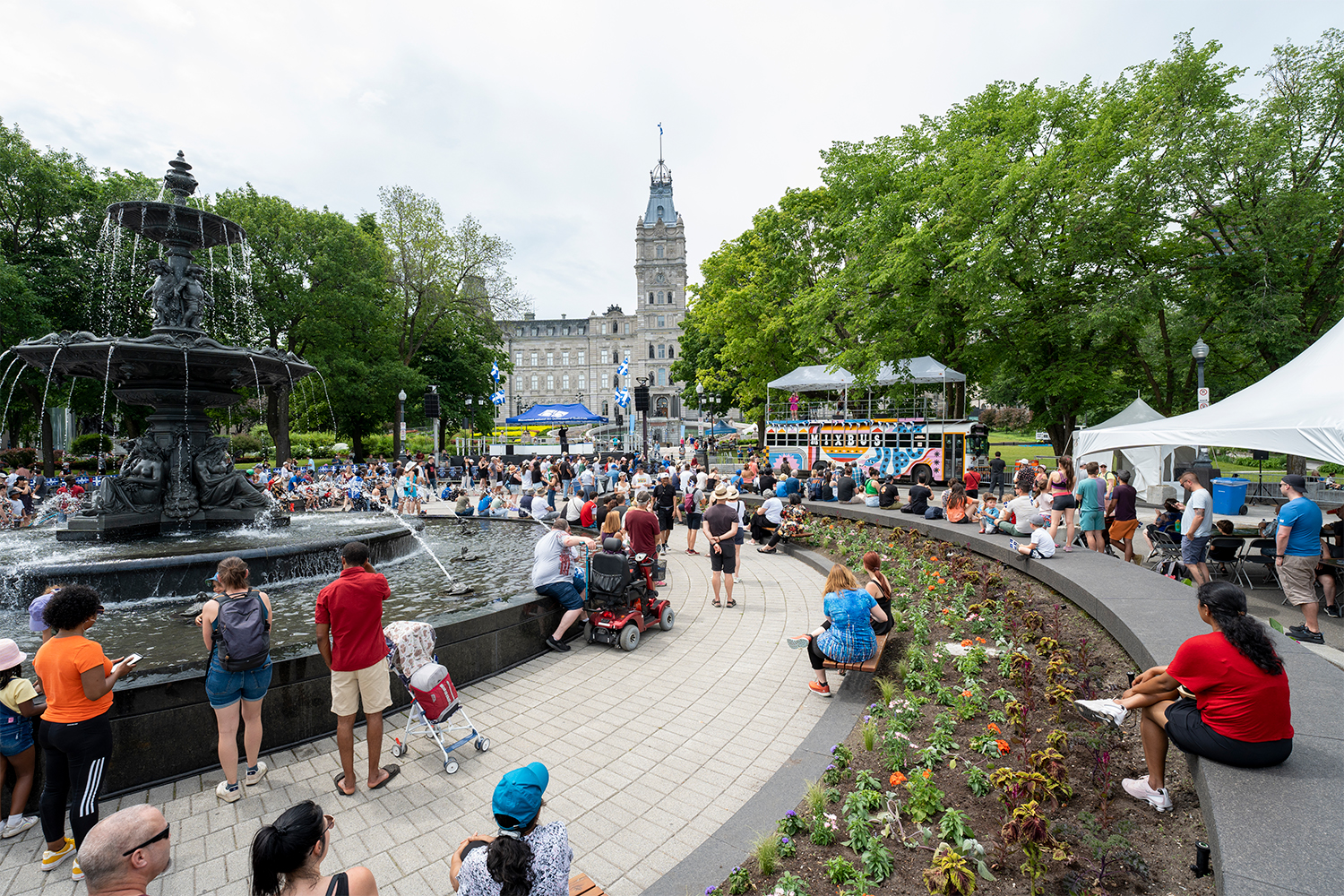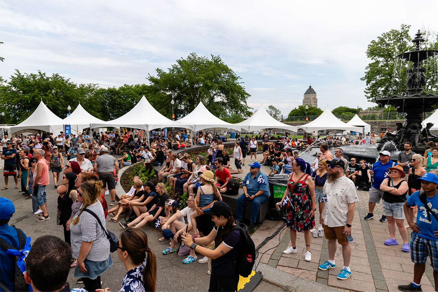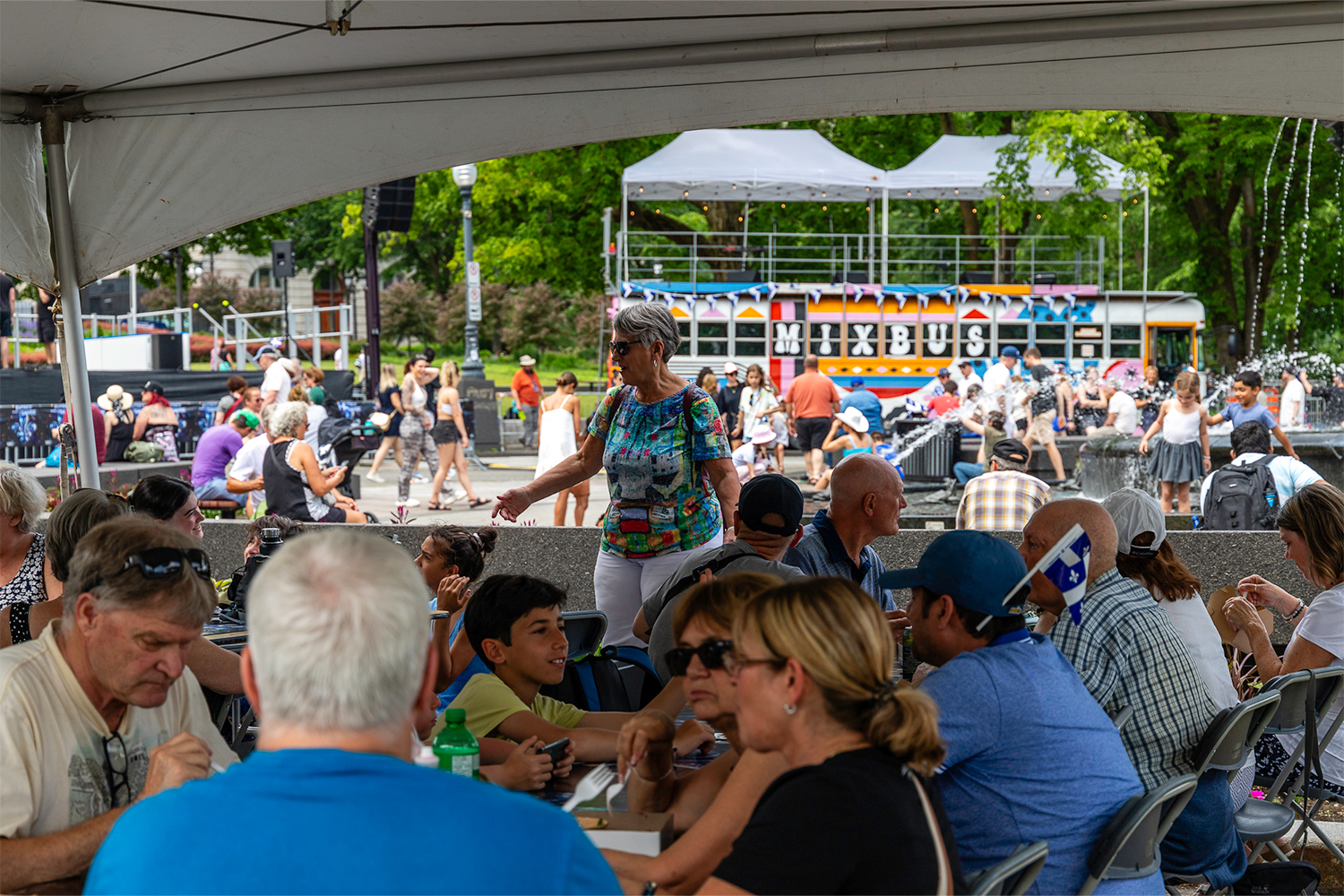 Dès 11 h, les participants pouvaient assister à l’hommage au drapeau qui célébrait le 75e anniversaire du fleurdelisé, avec pour toile de fond, l’hôtel du Parlement. Par la suite, les festivités de la Grande tablée se sont déroulées autour de la Fontaine de Tourny et l’accès au site était gratuit!