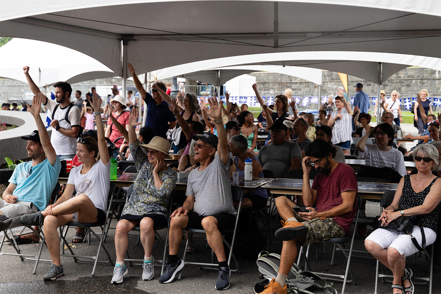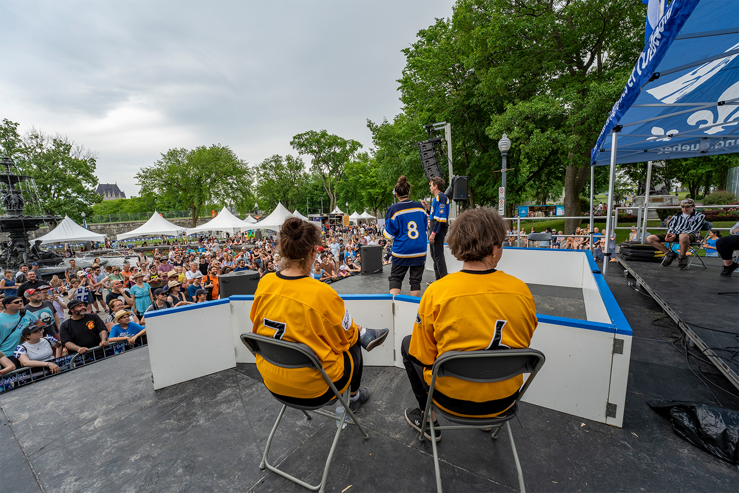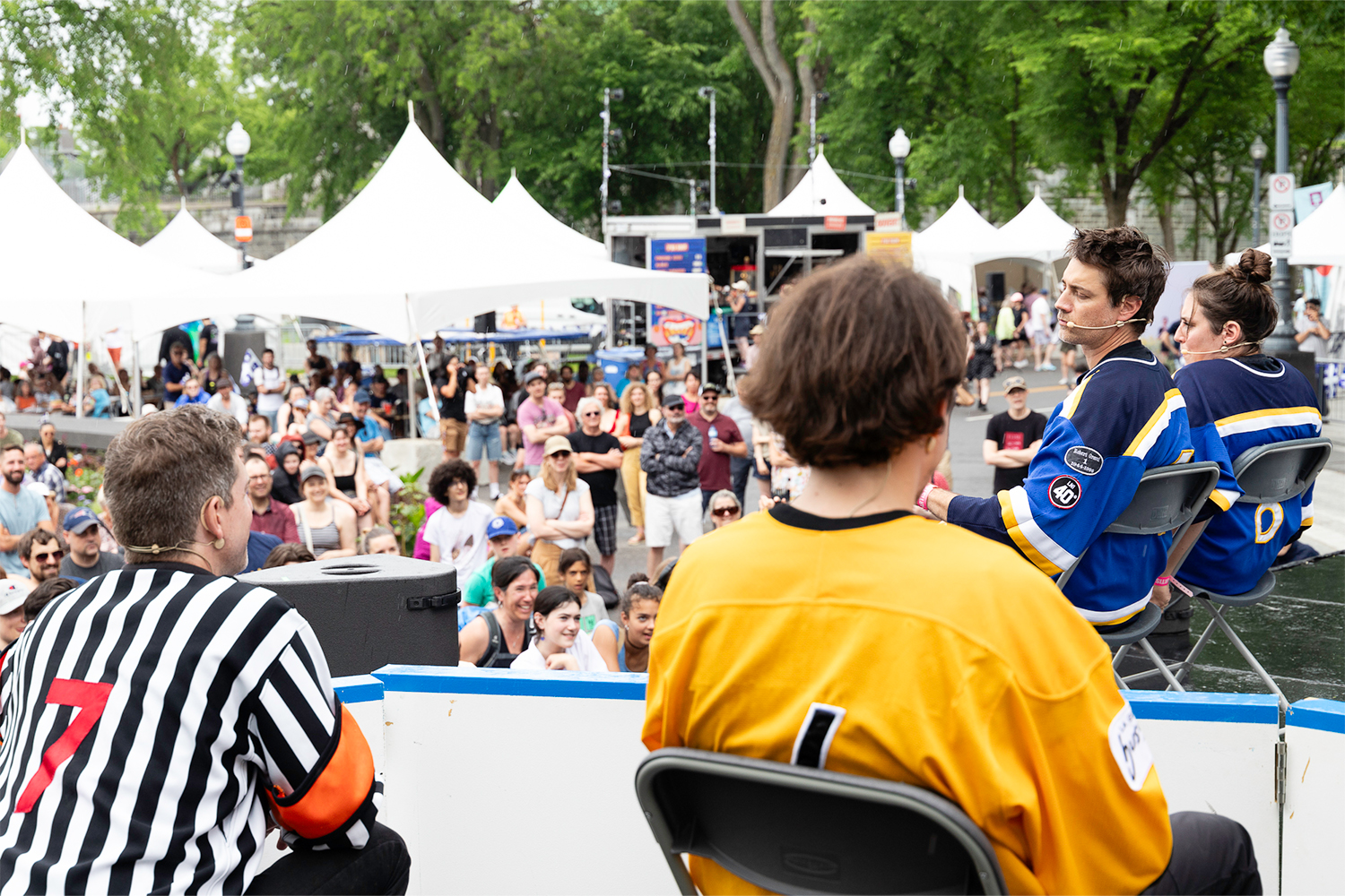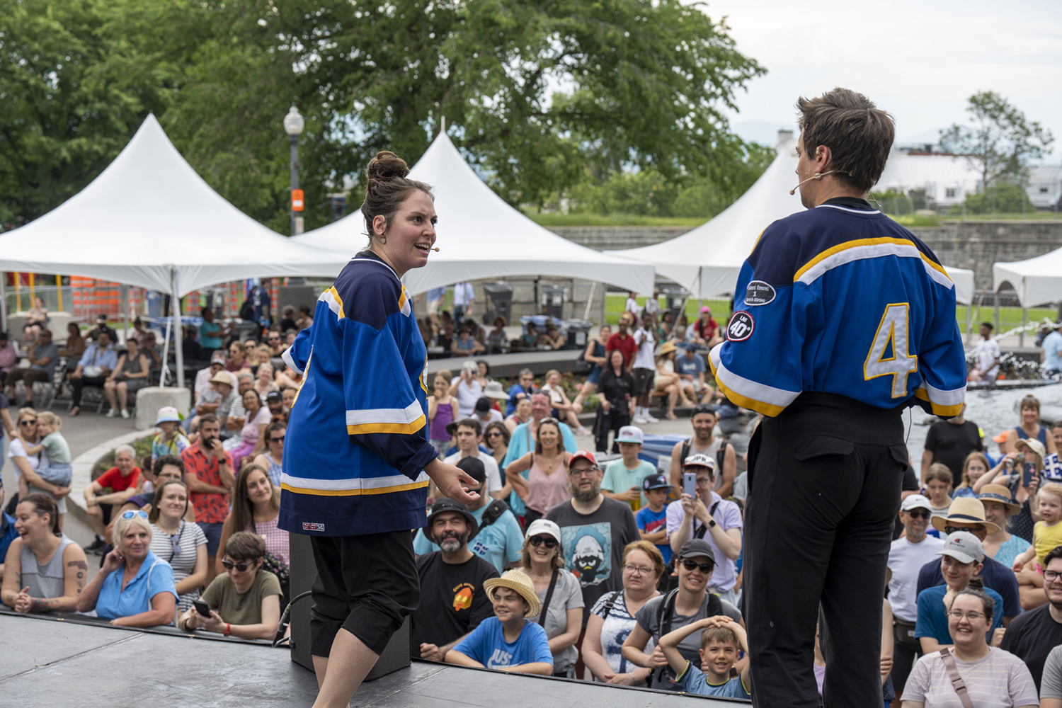 Dès 12 h, les personnes présentes dansaient et chantaient avec le groupe Alfa Rococo pour ensuite être conquises par deux performances de la Ligue nationale d’improvisation (LNI) avec le célèbre arbitre Simon Rousseau. Les improvisateurs.trices étaient : Salomé Corbo, Marie Eve Morency, LeLouis Courchesne et Jean-François Nadeau. Malgré les quelques gouttes de pluie, le public était au rendez-vous et votait avec conviction pour l’équipe de leur choix ! Une touche d’humour et d’art de la scène bien de chez nous, qui a su s’intégrer parfaitement à ce bel événement.