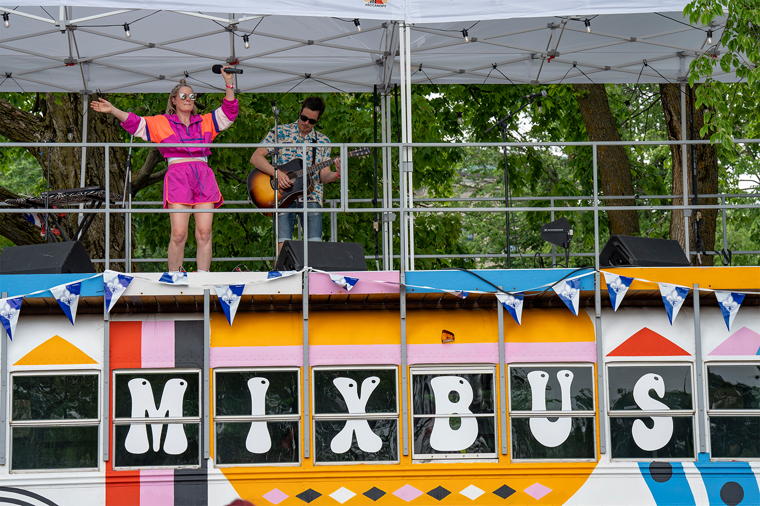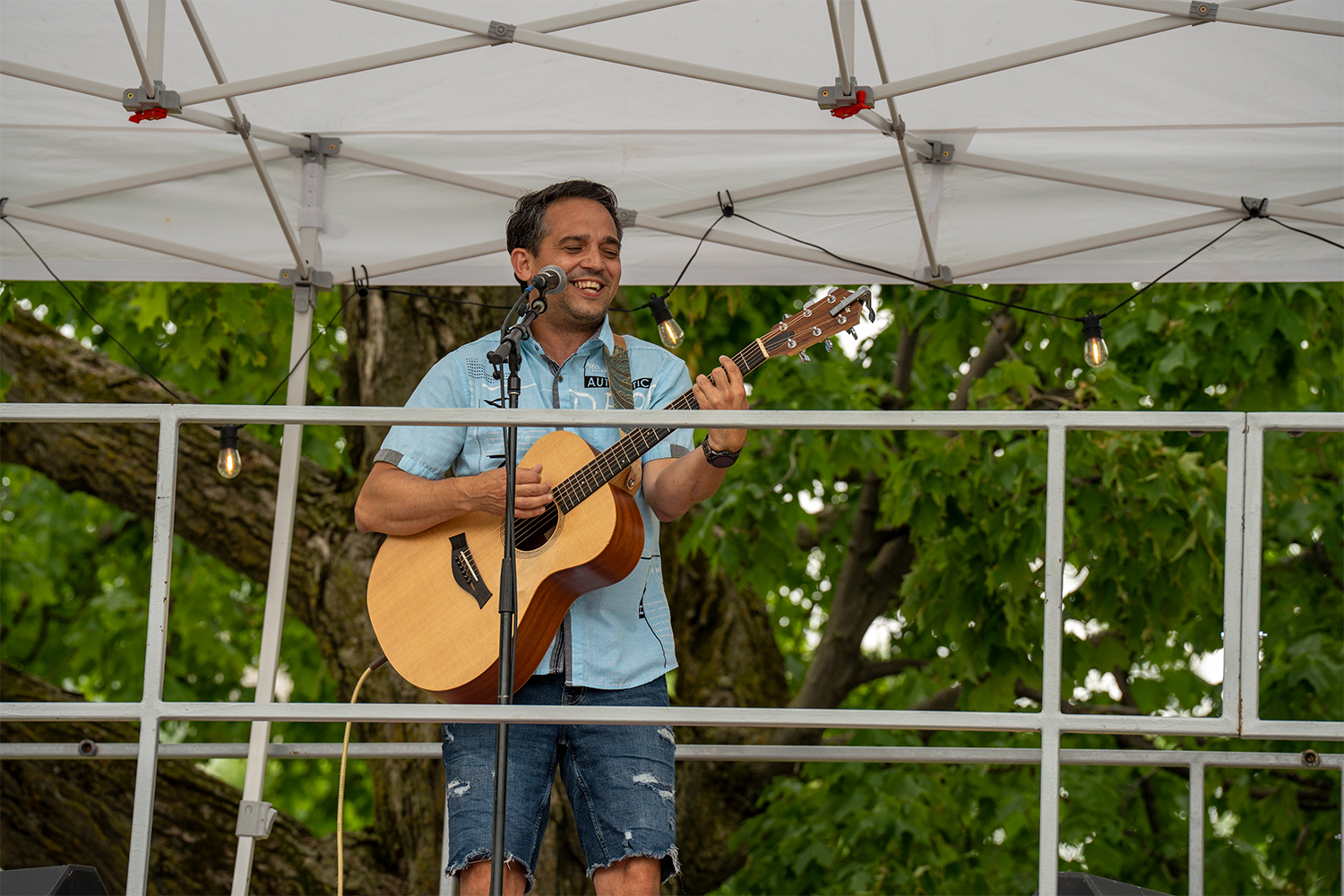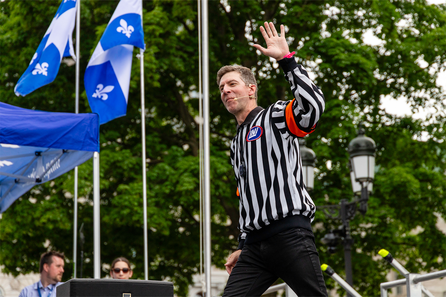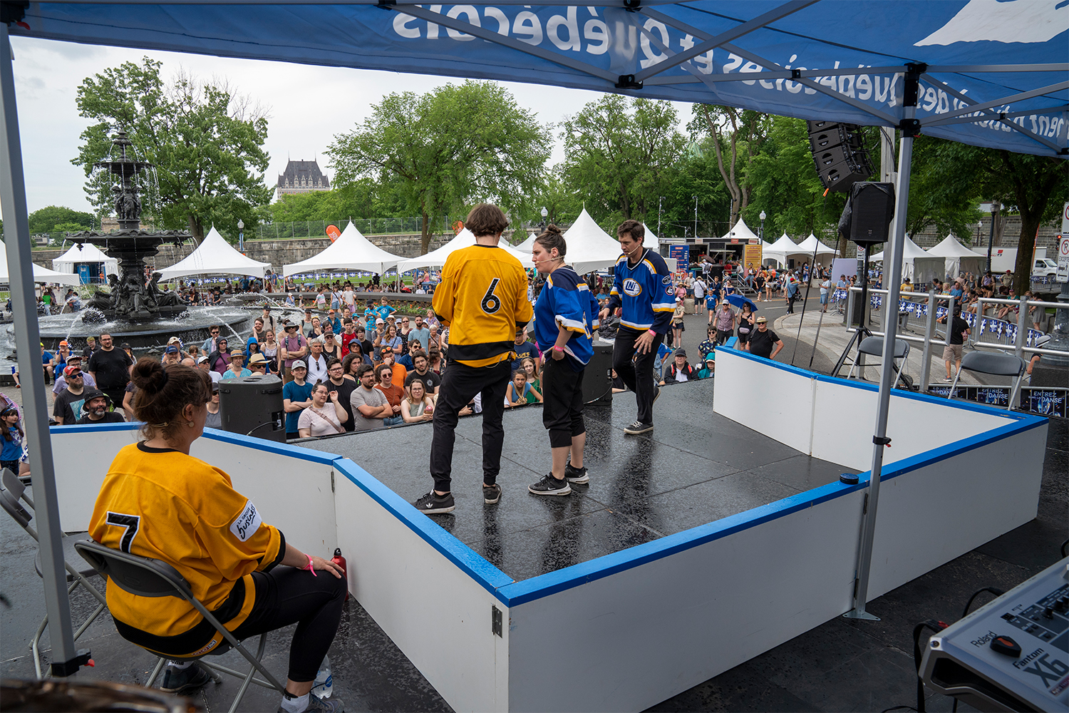 Dès 12 h, les personnes présentes dansaient et chantaient avec le groupe Alfa Rococo pour ensuite être conquises par deux performances de la Ligue nationale d’improvisation (LNI) avec le célèbre arbitre Simon Rousseau. Les improvisateurs.trices étaient : Salomé Corbo, Marie Eve Morency, LeLouis Courchesne et Jean-François Nadeau. Malgré les quelques gouttes de pluie, le public était au rendez-vous et votait avec conviction pour l’équipe de leur choix ! Une touche d’humour et d’art de la scène bien de chez nous, qui a su s’intégrer parfaitement à ce bel événement.